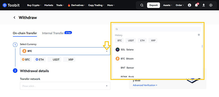 در این صفحه، شما باید ارز دیجیتالی که قصد انتقالش را دارید را انتخاب کنید. کافی است در فیلد بالا بخشی از نماد اختصاری ارز را تایپ کرده و آن را سرچ کنید؛ مثلاً فرض کنید ارز دیجیتال مورد نظر ما تتر (USDT) مبتنی بر شبکه TRC-20 است.